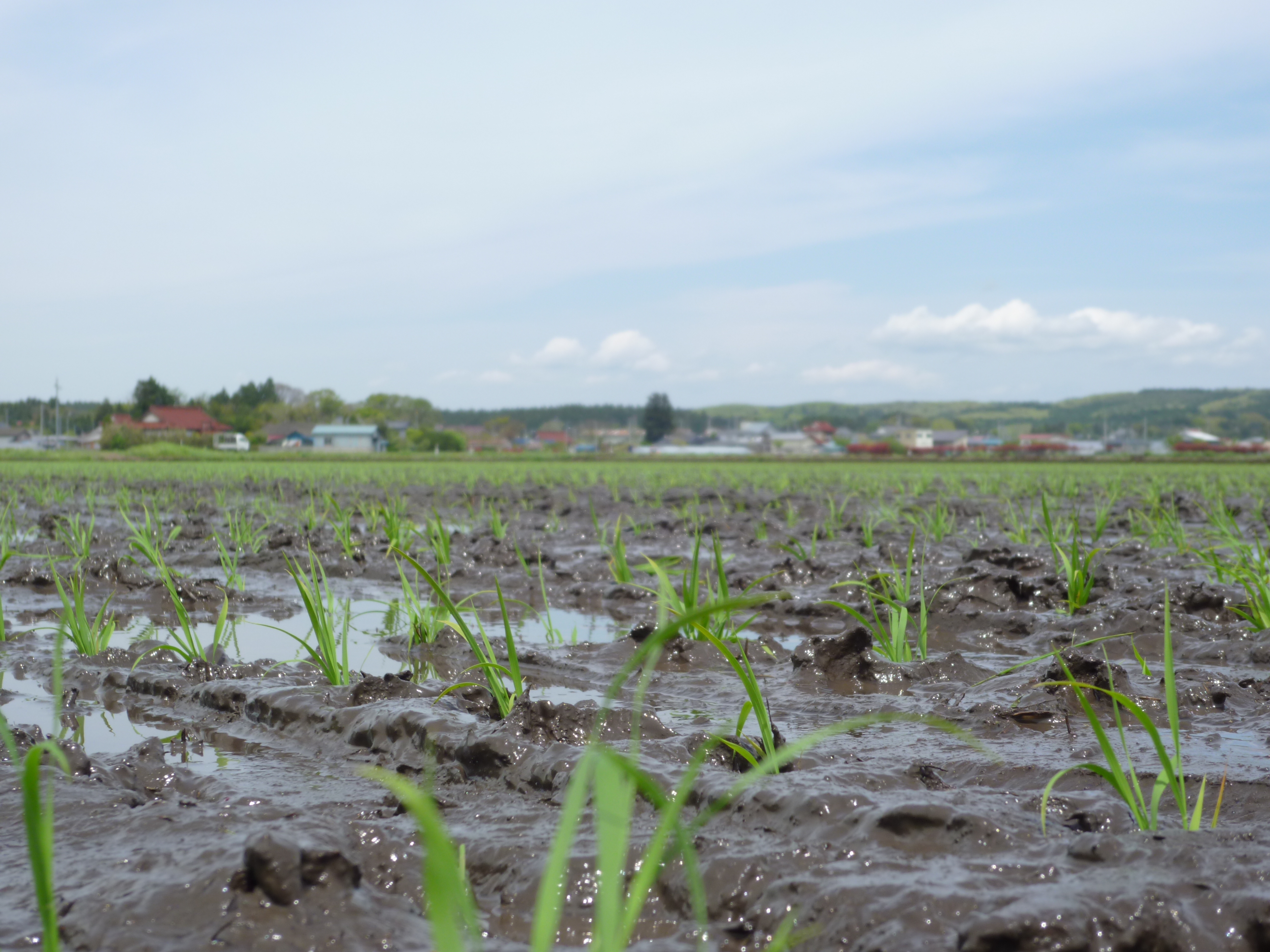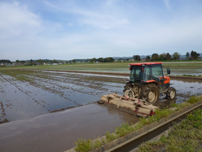 <代かき 田んぼに水を入れ均平に耕し、苗が植えられる状態にする作業です。田んぼに高低差ができると、田んぼの水が均等に張れず雑草が生える原因となります。田植えの前に丁寧に丁寧に行います。